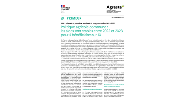 Ces fiches, composées d’illustrations, tableaux et commentaires descriptifs, accompagnent une publication nationale Agreste - Primeur N°5 - Bilan de la première année de programmation 2023-2027.