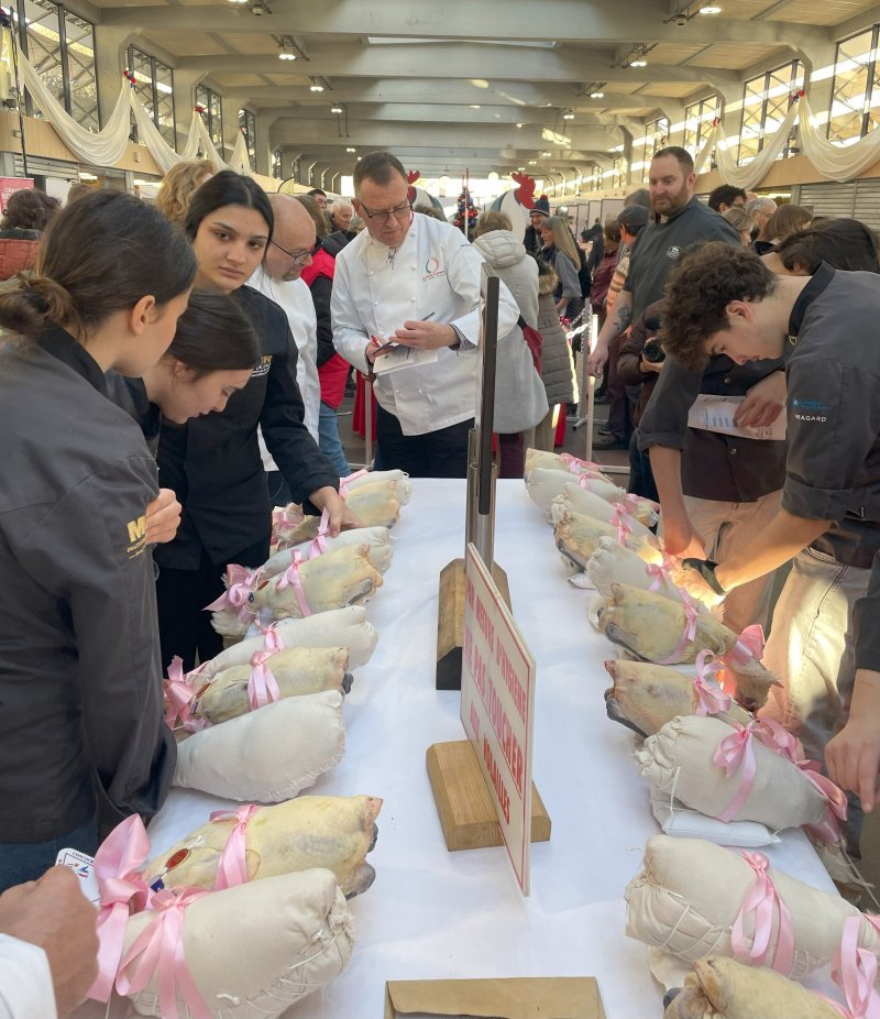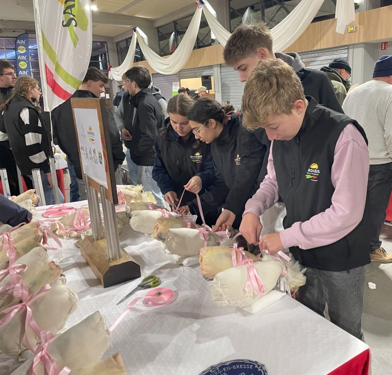 les bacs pros CGEA (Conduite et Gestion d’une Entreprise Agricole) ont élevé, emmaillotté leurs poulardes de Bresse en vue du concours des Glorieuses de Bresse. Le temps d’une matinée, les apprentis CAP Cuisine de la MFR de Balan devenaient juges pour élire la plus belle poularde des Sardières aux côtés d’un jury de professionnels. Les apprentis de cuisine ont appris à reconnaître les critères pour être Glorieuses : peau, plumes restantes, pattes, épiderme, état d’engraissement, emmaillotage…