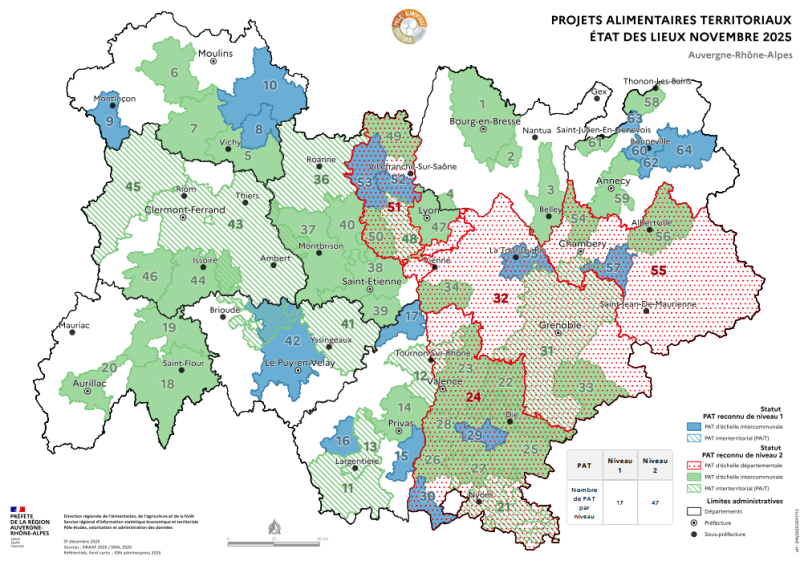 64 Projets Alimentaires Territoriaux (PAT) reconnus en Auvergne-Rhône-Alpes au 1er novembre 2025
